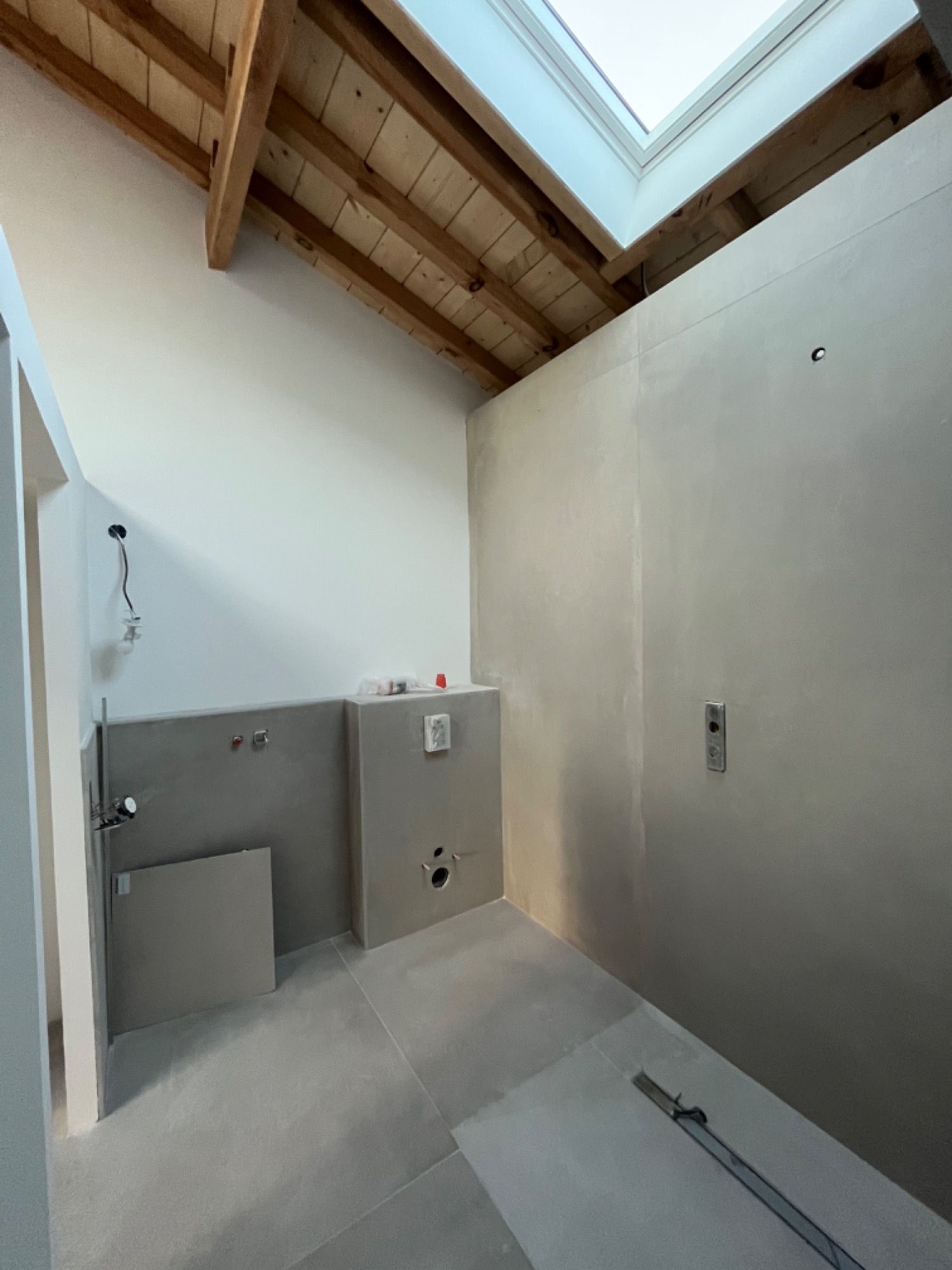 - Dalle quartz foncé et finitions bétons cirés murs intérieurs